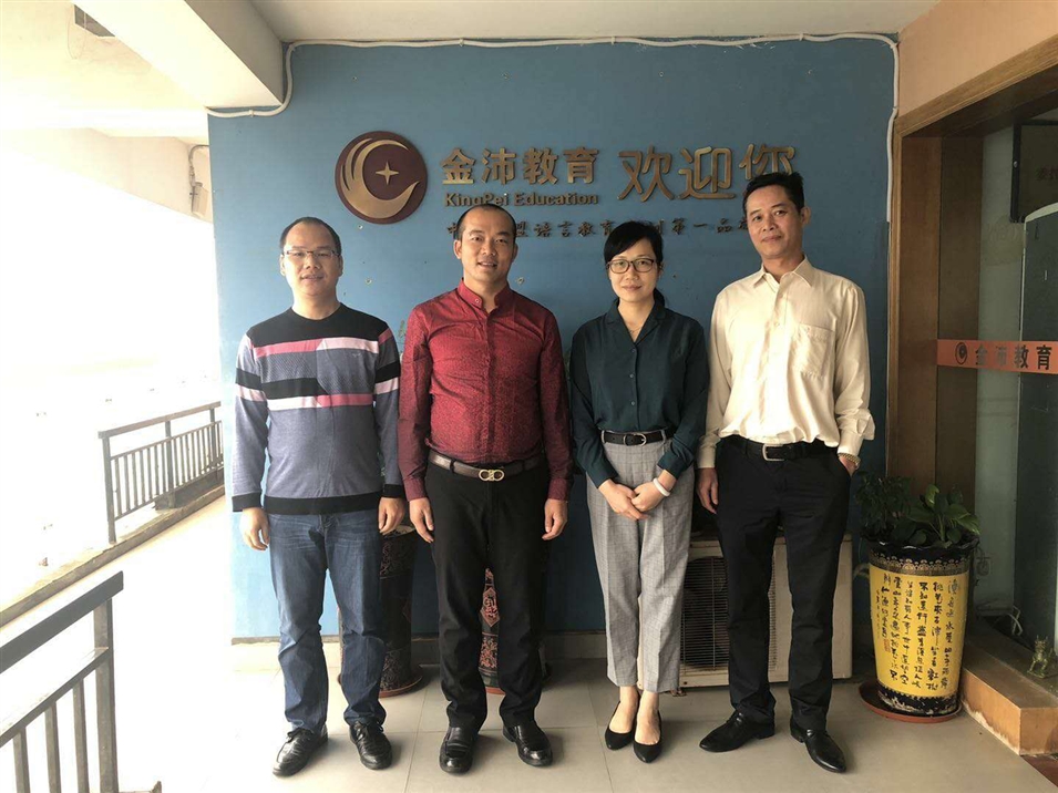 廣西金沛教育執(zhí)行董事粟宥朝左二)、國(guó)際部合伙人許顯鋒左一與廣西國(guó)際文化交流中心副秘書長(zhǎng)羅琨(右二)、經(jīng)濟(jì)科技部部長(zhǎng)吳偉(右一)一行合影留念