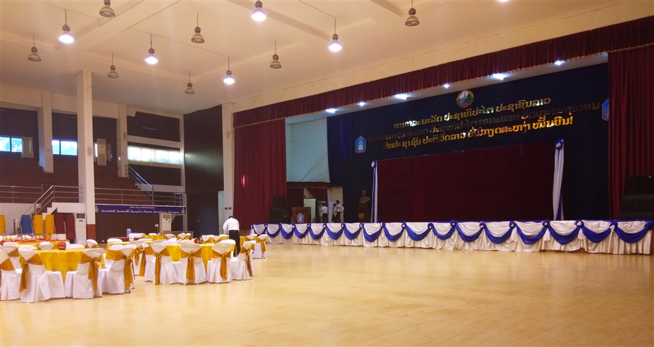 大禮堂在學(xué)校行政樓旁邊,很多人在《留學(xué)|直擊老撾國立大學(xué)入學(xué)現(xiàn)場》中看到過。大禮堂內(nèi)部裝飾得整潔明亮,正中央是舞臺,四周設(shè)有看臺,大廳中央也可以擺放一些桌椅,所以一般用于文藝演出和召開大型會議。