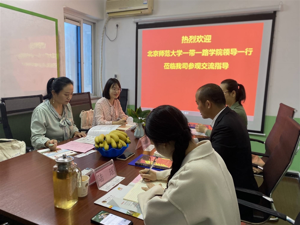 2021年4月7日上午,北京師范大學一帶一路學院陳健博士、李邵悅老師一行蒞臨我司參觀交流指導,我司執(zhí)行董事粟宥朝先生、校長張金雪女士、國際部專員陸瑤女士等參加了座談。