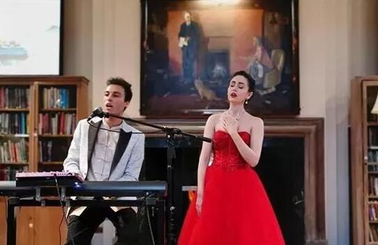 亞當(dāng)·戴維斯(左)與菲比·海恩斯(右)在倫敦的孔子學(xué)院活動(dòng)上表演中文歌曲